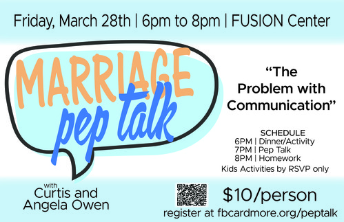 Marriage Pep Talk was created to help married couples and engaged couples work to make their relationship even stronger. We will focus on Christ centered skills to give us a boost in our relationships.